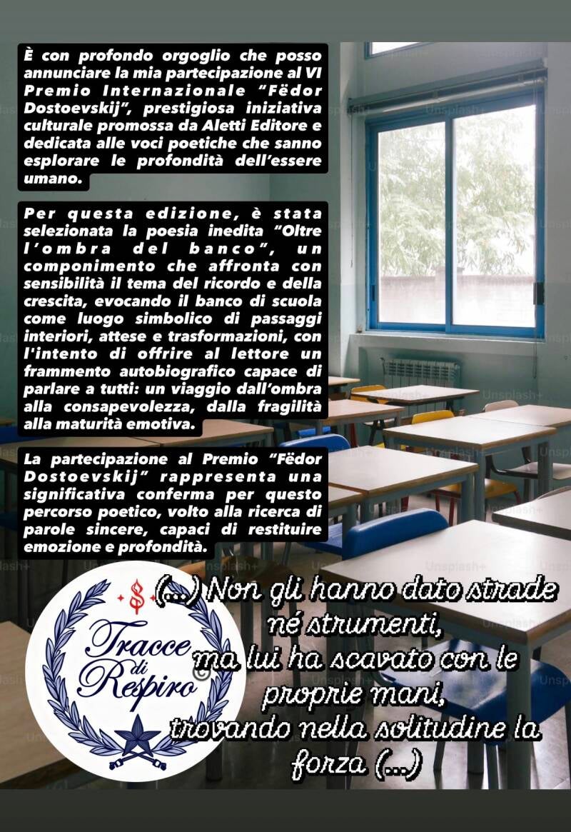 È con profondo orgoglio che posso annunciare la mia partecipazione al VI Premio Internazionale “Fëdor Dostoevskij”, prestigiosa iniziativa culturale promossa da Aletti Editore e dedicata alle voci poetiche che sanno esplorare le profondità dell’essere umano.